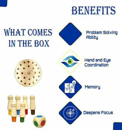 - Includes a solid wooden board, dice, and 24 wooden pegs in six bright colors for easy handling